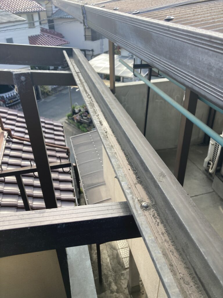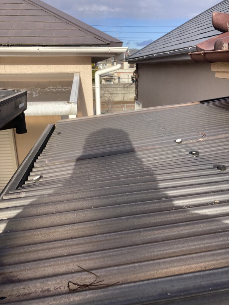 残っているポリカ波板も全体的に劣化が進んでおり、固定ビス周りの負担が大きくなっている様子が見受けられました。特に風を受けやすい端部は、ビスの効きが甘くなりやすく、今回のような飛散につながりやすいポイントです。